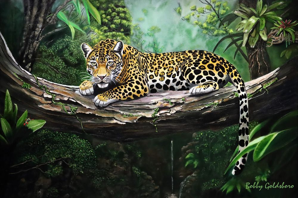 A gorgeous Siberian tiger cools down on a hot afternoon. Bobby has captured the awesome beauty of this magnificent animal in this very detailed oil painting.