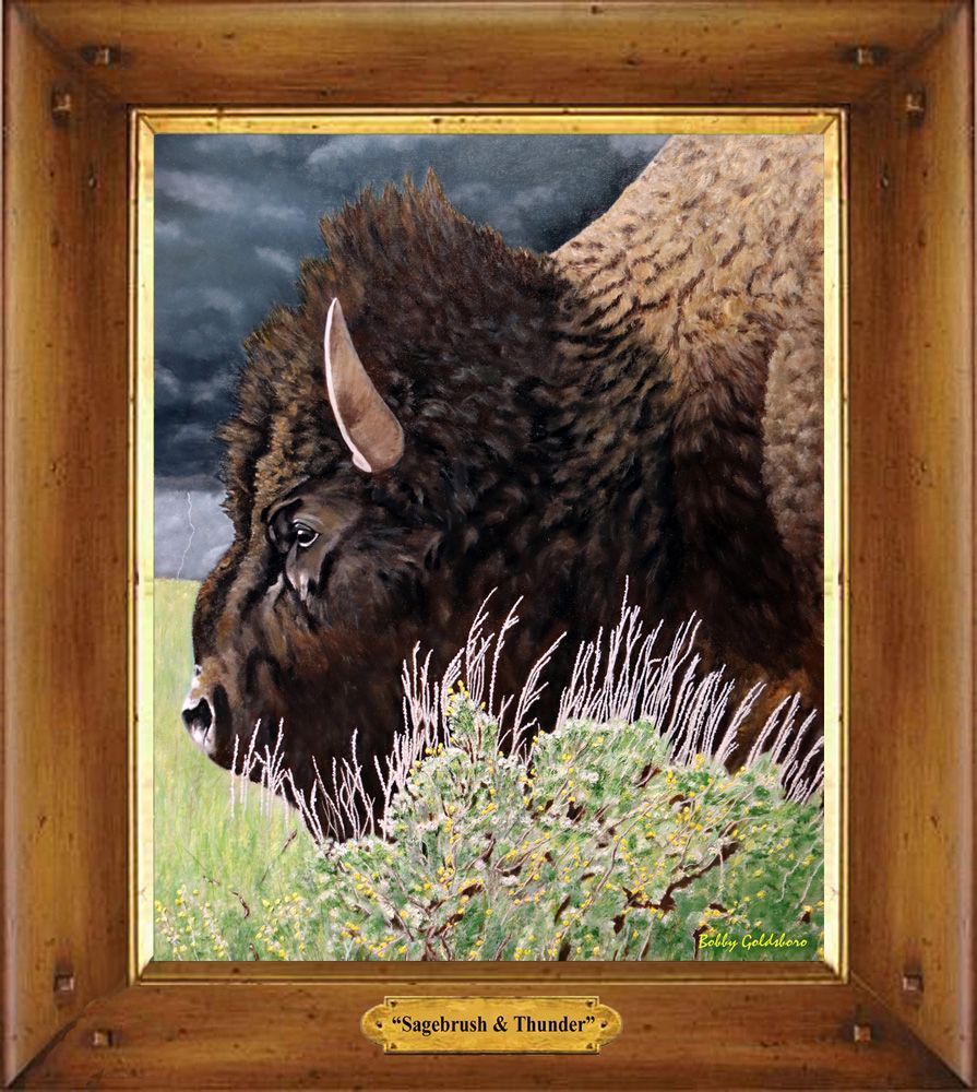 An incredibly detailed painting of the iconic bison with an approaching storm. Bobby photographed this giant in Jackson Hole, WY.