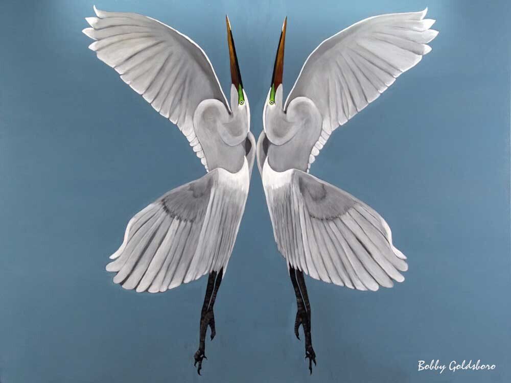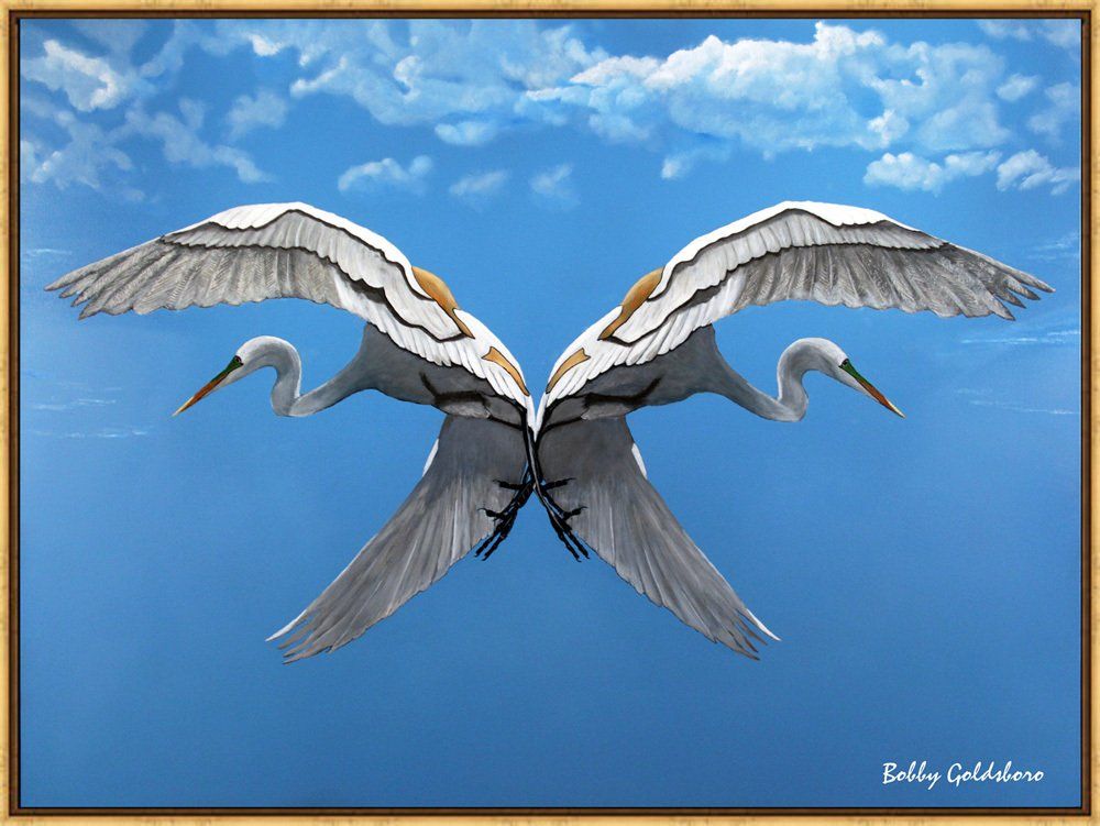 Size: 48W x 36H Original Oil Painting on Belgian linen, gold floater frame $11,500 SOLD A large, glorious painting of two great egrets soaring among the clouds in an angel-like dance!