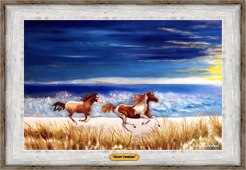 An Appaloosa and a painted pony race to catch the sunset. A gorgeous oil painting.