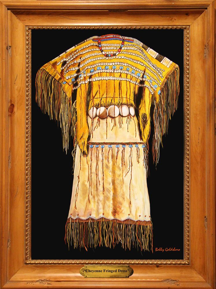 A very detailed painting of a Cheyenne fringed and beaded dress from the 1870's.