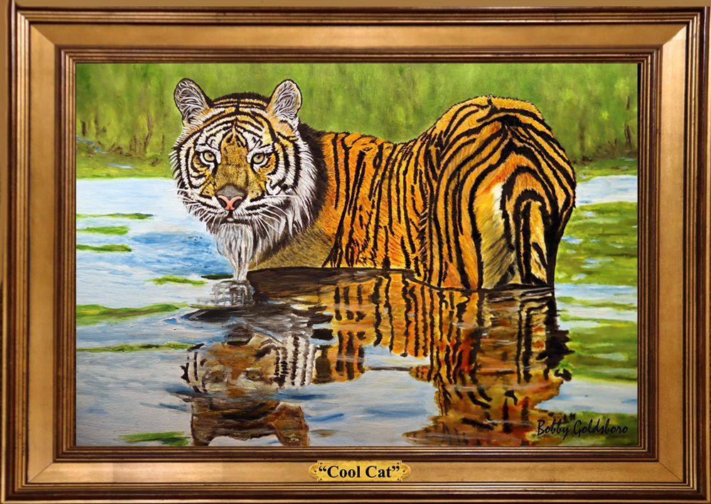 A gorgeous Siberian tiger cools down on a hot afternoon. Bobby has captured the awesome beauty of this magnificent animal in this very detailed oil painting.