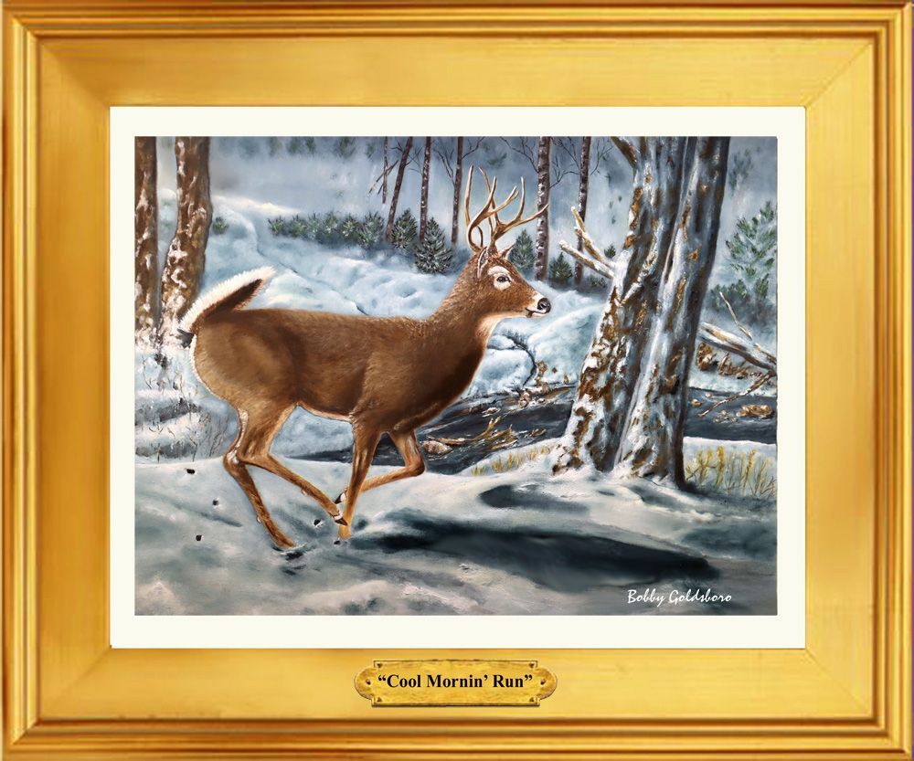 A beautiful whitetail deer greets the morning as he gallops past a rocky creek. A captivating oil painting.
