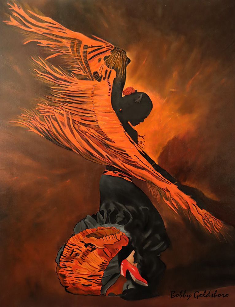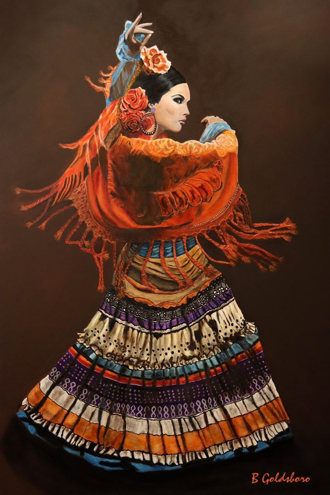 Size: 52H x 40W A breath-taking painting of a flamenco dancer performing her fiery movements. The first in a new series of flamenco-inspired oil paintings.