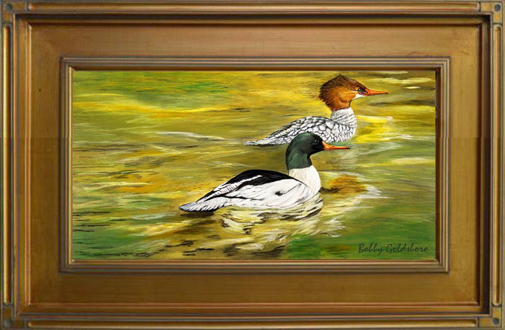 Two magnificent common mergansers enjoy the waters of the Grand Tetons. Dianne photographed them and Bobby painted them. Original Oil Painting $6,500 SOLD