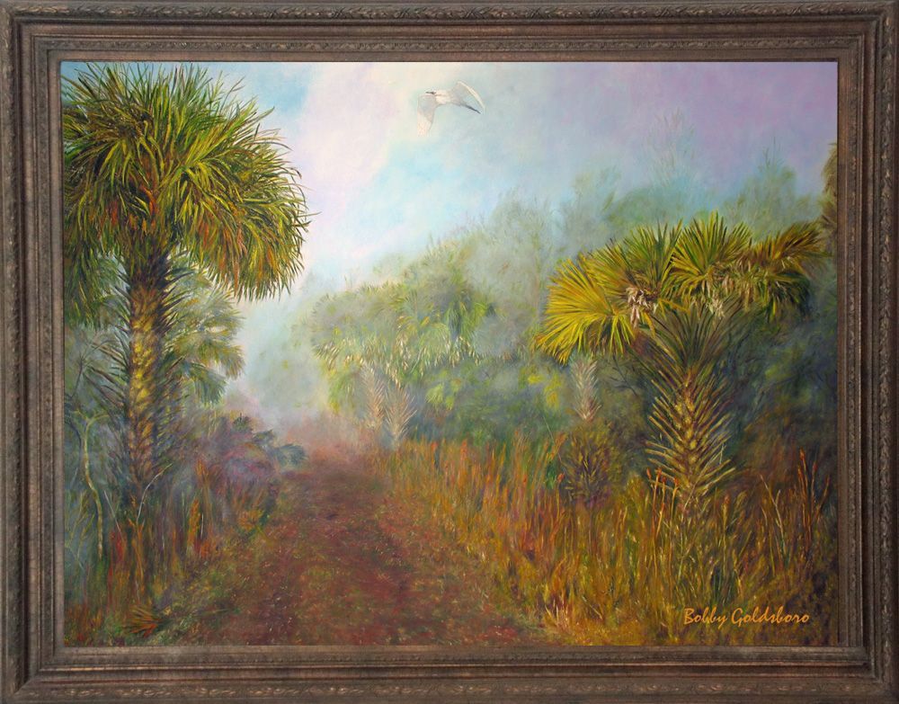 Size Framed: 46H x 58W Original Oil Painting $9,500 Morning on the Intracoastal at Bing's Landing near Hammock Beach, Fl. These prairie marshes are the subject of many of Bobby's paintings.