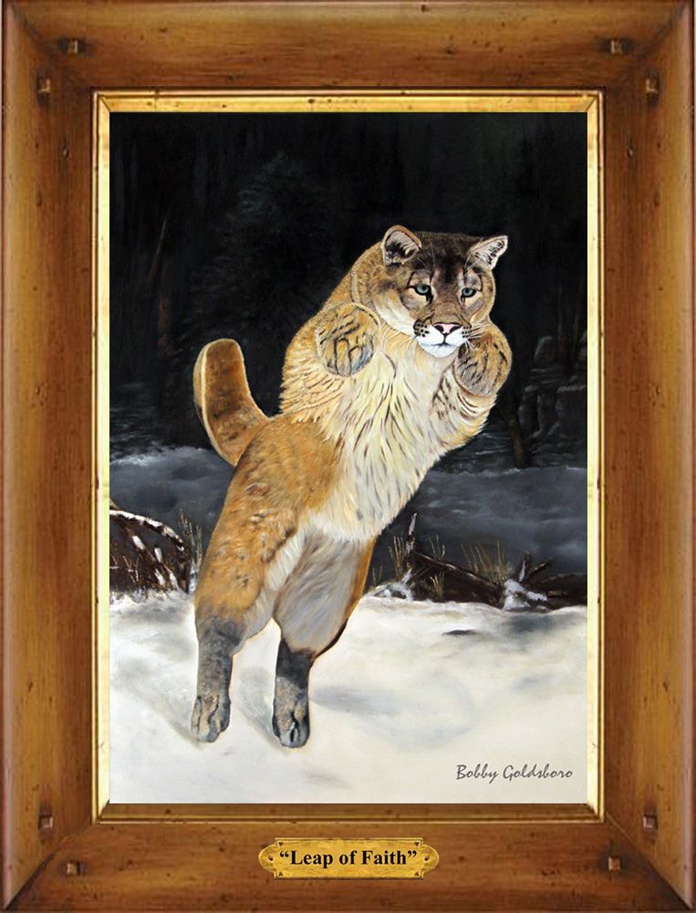 Size: 24W x 36H Original Oil Painting $9,500 SOLD Moonlight reveals a startlingly beautiful mountain lion! Bobby has created a masterpiece with this snowy scene. Canvas Print Available in Wildlife Collection.