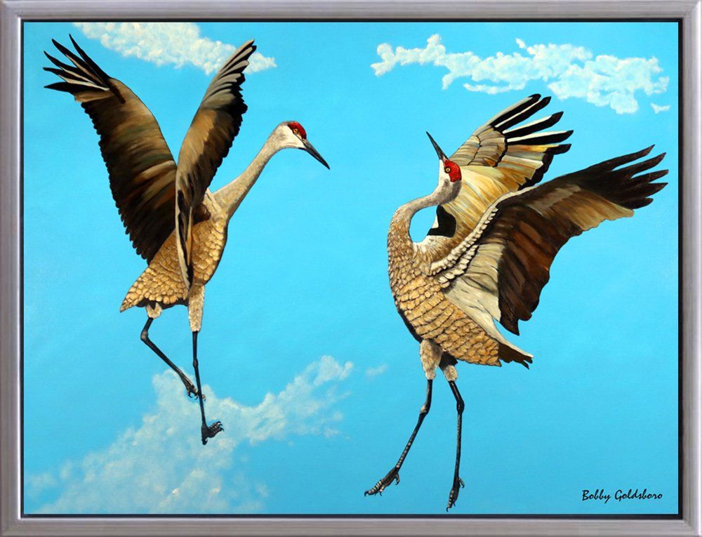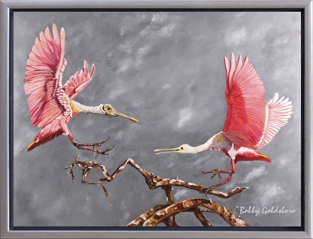 Size: 30H x 40W Original Oil Painting on linen $9,500 SOLD Two roseate spoonbills begin the mating dance. Bobby's study of these birds has resulted in a beautiful oil painting.