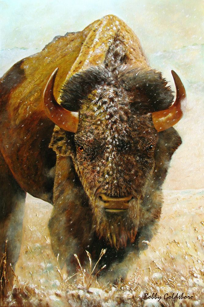 Size: 42H x 36W Framed Original Oil Painting $9,000 An incredibly detailed painting of the iconic bison with an approaching storm. Bobby stood ten feet from this giant in Jackson Hole, WY.