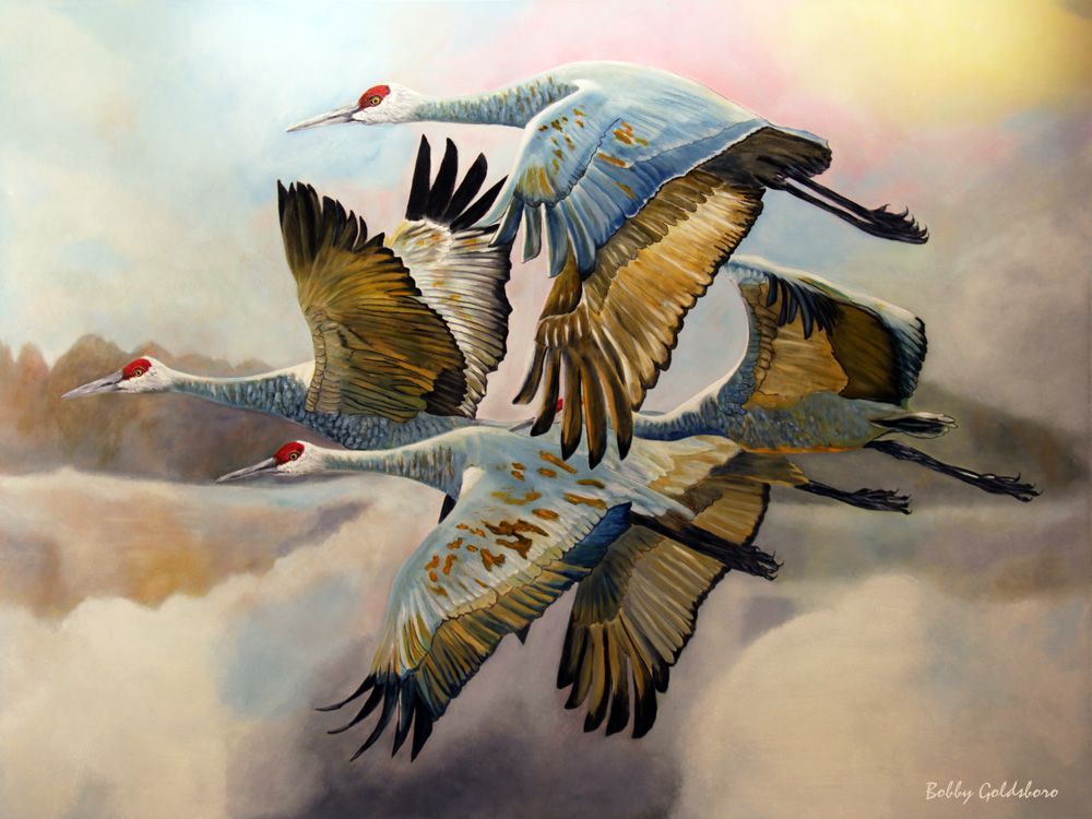 Five sandhill cranes soar in the early, misty morning in this contemporary piece. These gorgeous birds migrate every year from Bobby's Florida home to Jackson Hole.