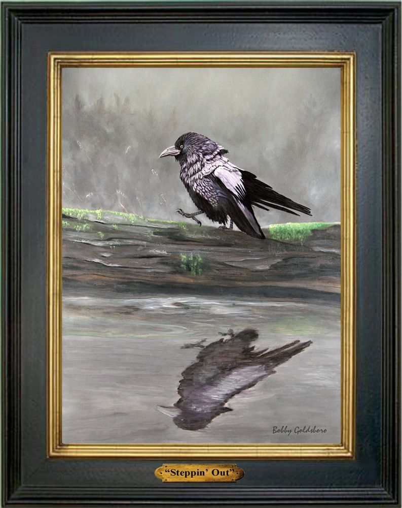 A raven with attitude goes for an early morning stroll in the forest. An enchanting painting!