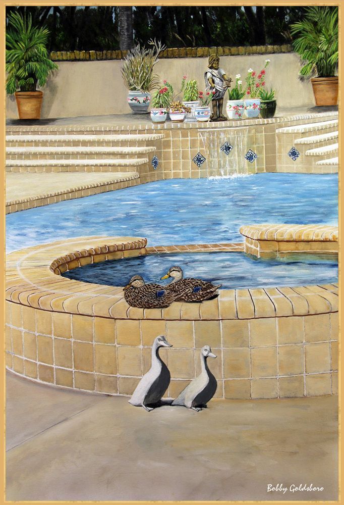 Size: 36H x 24W $20,000 An architectural masterpiece! This client's gorgeous pool area included live ducks, a bronze angel, ten pots with designs and plants, hundreds of squares and curves, etc. This oil painting looks like a photograph!