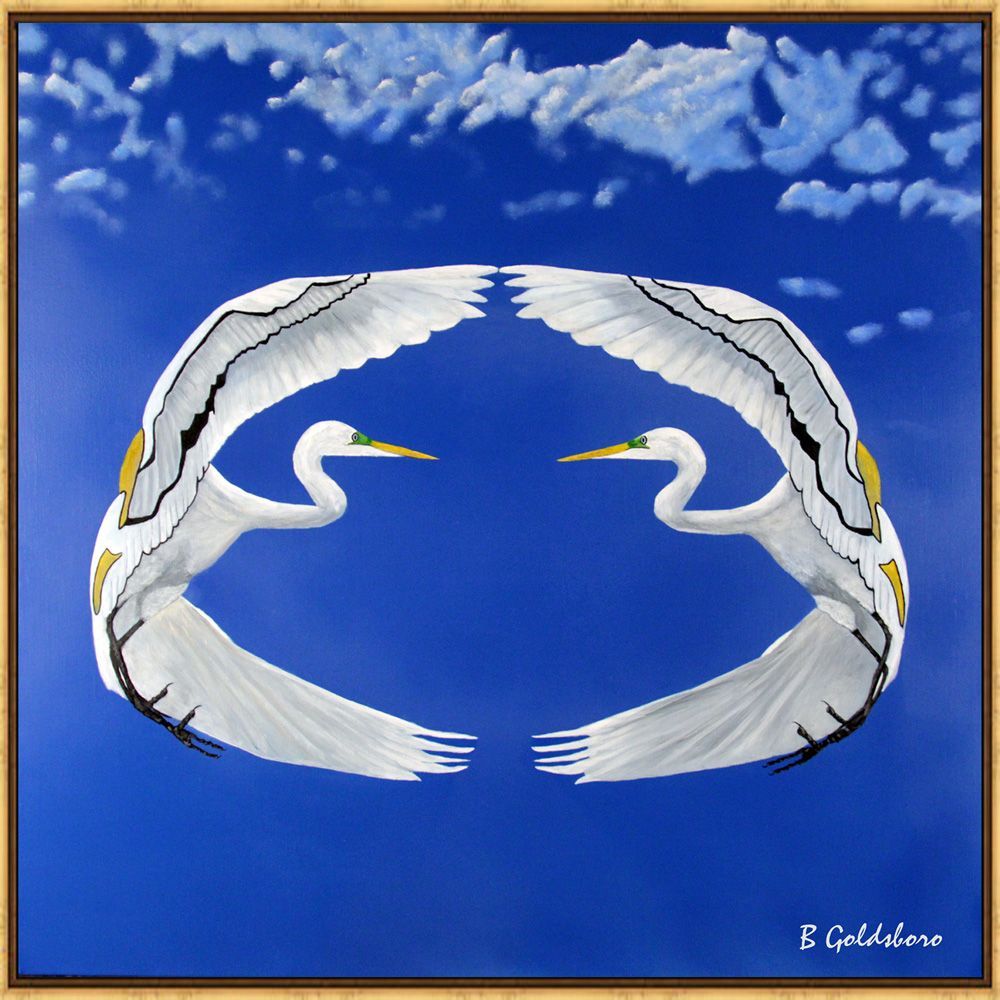Size: 48W x 36H It might be an angel...maybe a butterfly...this enchanting contemporary oil painting of two egrets flying back to back is a treat for the eyes!