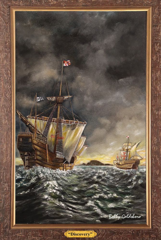 An incredible painting of the Santa Maria and the Nina as they approach the "new world." The clients loved the detail in the period ships. One new painting....Two new friends!