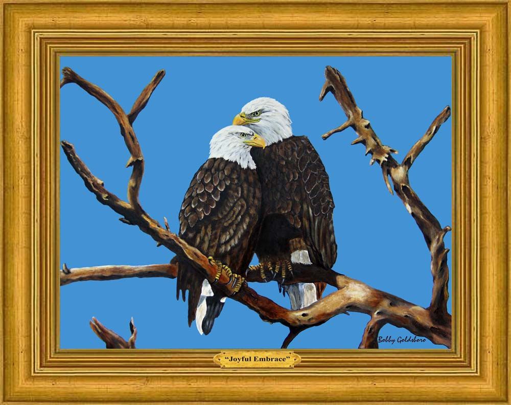 Size: 24W x 18H Joyful Embrace was commissioned by a friend. A photo of the two eagles was sent to Bobby and he brought them to life. Amazingly life-like!
