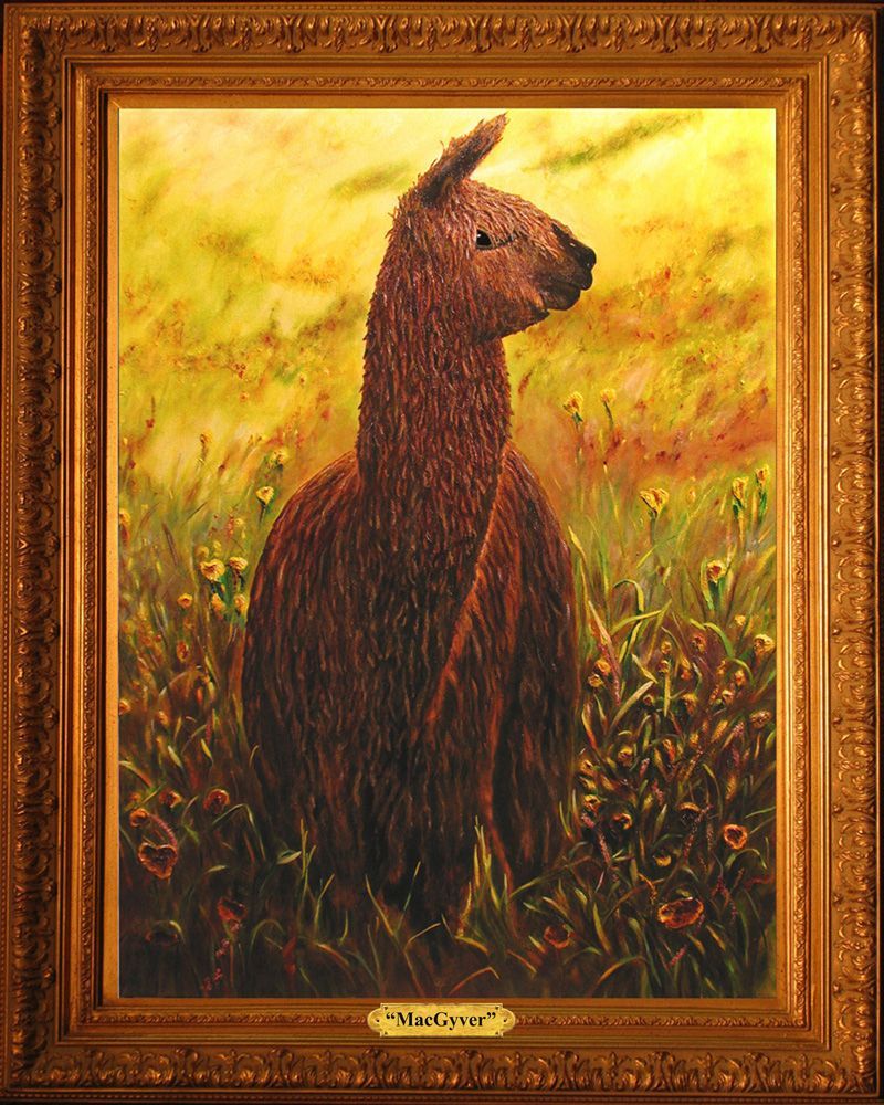 Size: 30W x 40H Bobby was commissioned to paint MacGyver, a 6-time World Champion alpaca. This incredible animal is brought to life in this stunning oil painting.