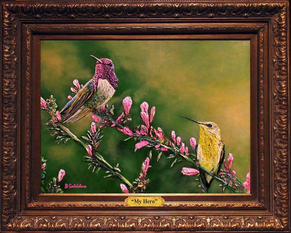Size:16H x 20W A female Costa's hummingbird admires her mate as he surveys his kingdom. Commissioned by a friend in St. Charles, MO.