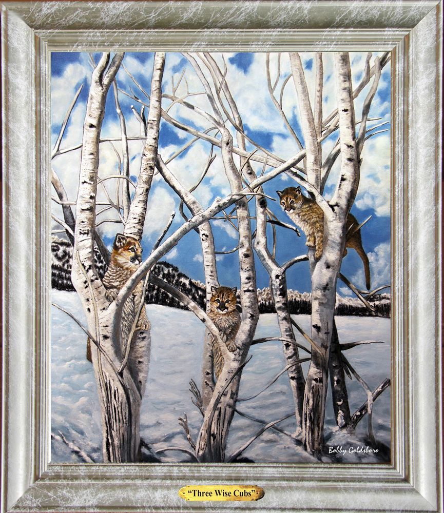 Size: 24H x 20W Three gorgeous mountain lion cubs explore the Aspens in Colorado. They were photographed on the client's property. Bobby has painted a once-in-a-lifetime moment!