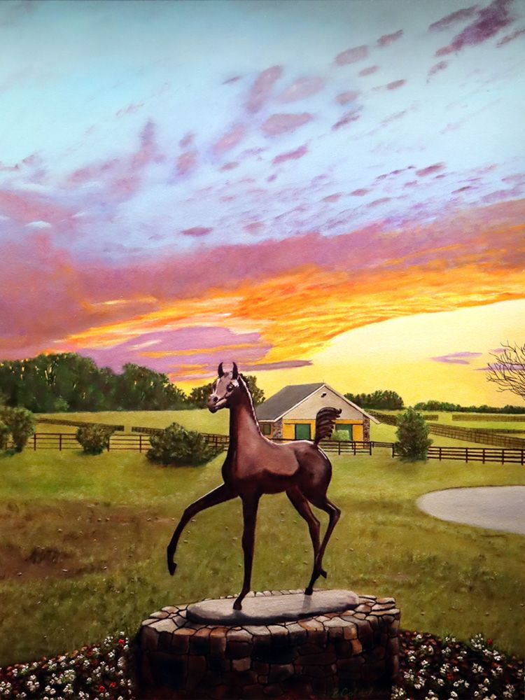 An Arabian horse breeder took a gorgeous sunset photo of her horse farm and commissioned Bobby to paint it! ! Beautiful!Size: 30W x 40H