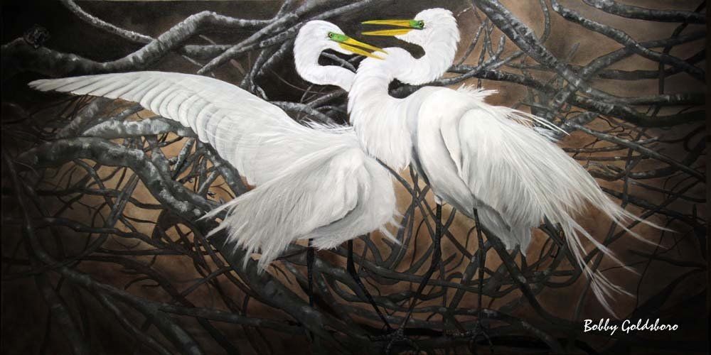 Size: 30H x 40W Original Oil Painting on linen $9,500 SOLD Two roseate spoonbills begin the mating dance. Bobby's study of these birds has resulted in a beautiful oil painting.