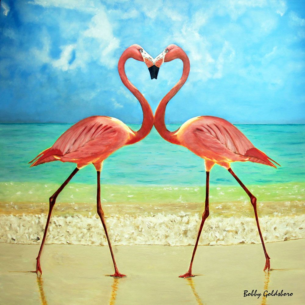 Size: 40W x 40H SOLD Two flamingos meet on the beach to form one heart. A client commissioned Bobby to paint this enchanting scene.