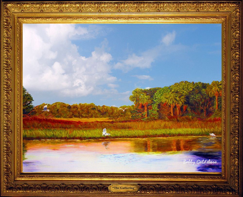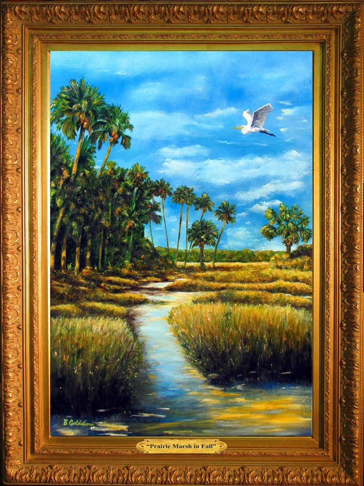 Size Framed: 46H x 58W Original Oil Painting $9,500 Morning on the Intracoastal at Bing's Landing near Hammock Beach, Florida. These prairie marshes are the subject of many of Bobby's paintings.