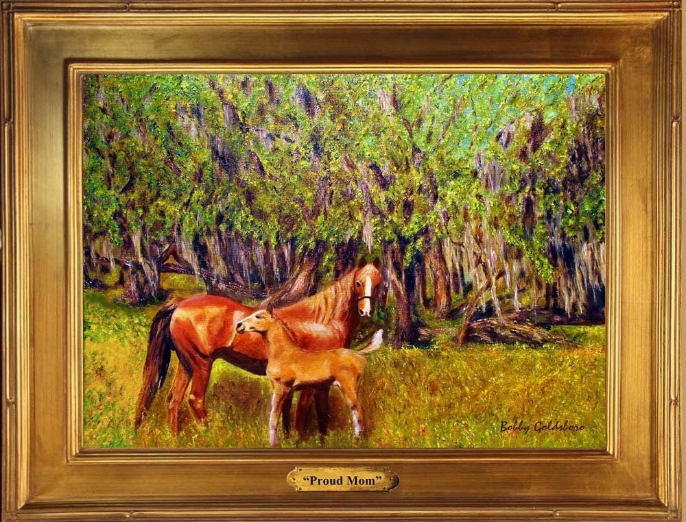 One of Bobby's first paintings! A beautiful mare stands proudly with her new foal, a scene reminiscent of the Ocala horse country of central Florida.