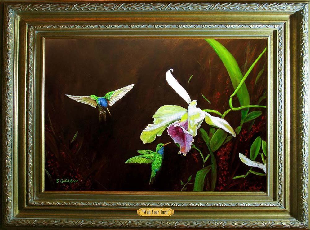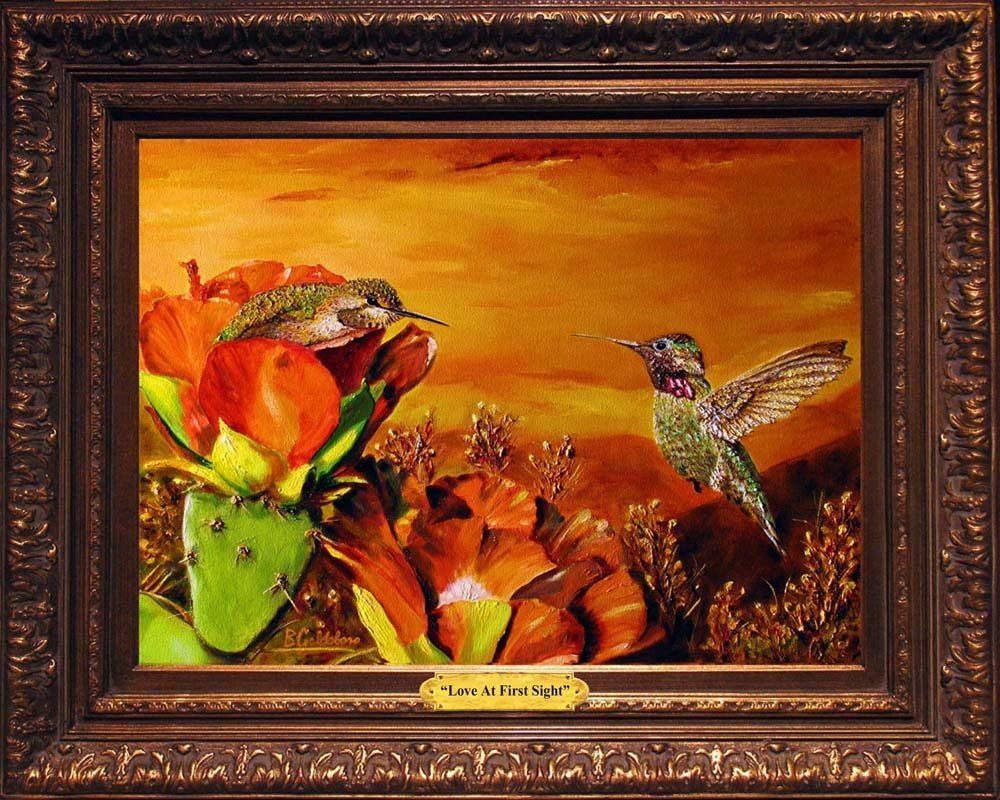 A broad-billed hummingbird has his own private buffet among the cactus flowers. This painting is now a part of the permanent collection at the Arizona-Sonora Desert Museum in Tucson!