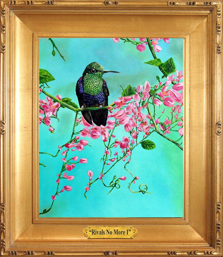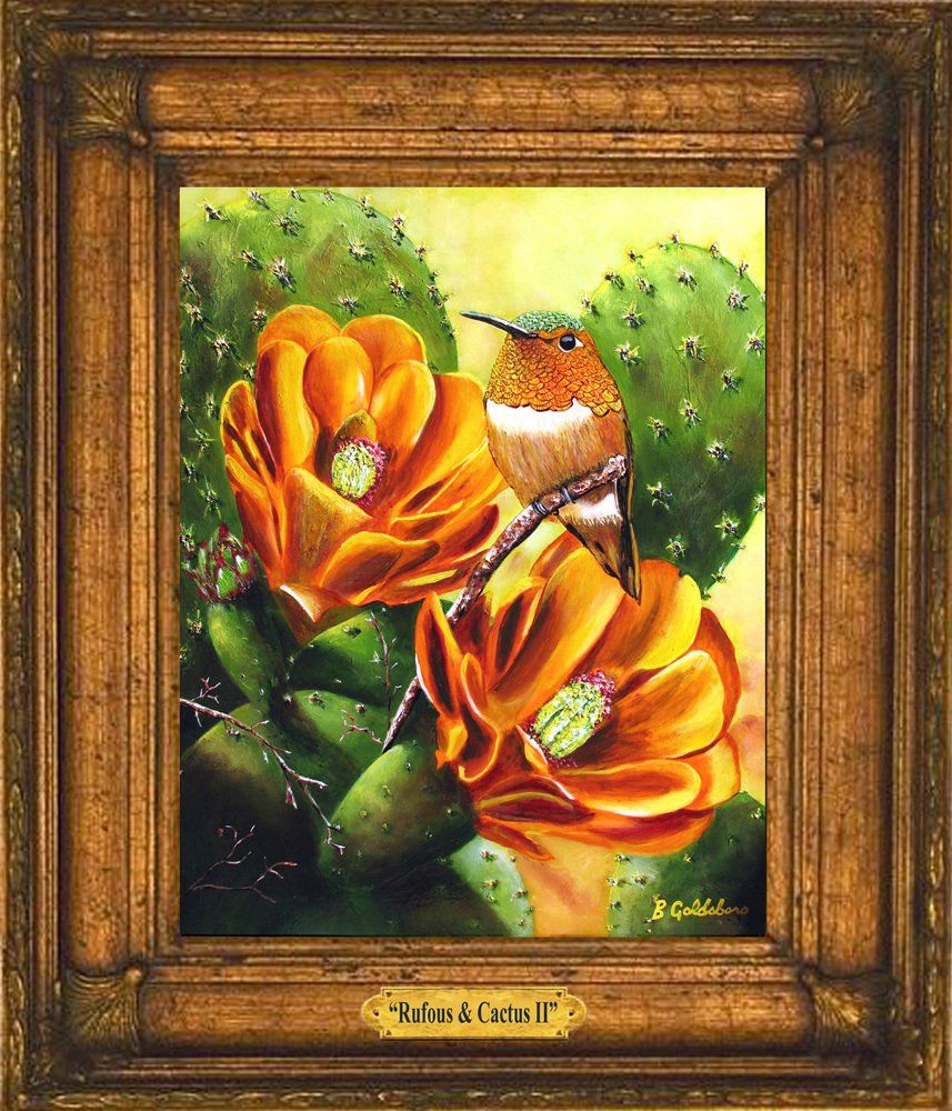 An incredibly detailed Rufous hummingbird sits among the cactus. A perfect match for Rufous & Cactus I.