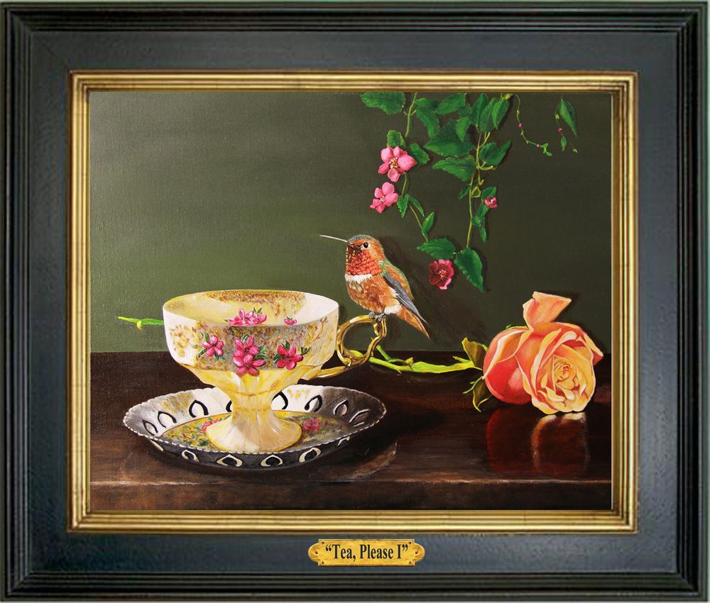 A life-like Ruby-Throated hummingbird hovers above a tea cup. Gorgeous!